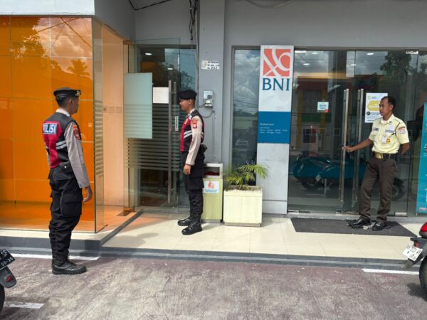 Sukamara – Giat patroli Harkamtibmas dan pencegahan aksi premanisme dilaksanakan oleh personel Sat Samapta Polres Sukamara di Bank BNI