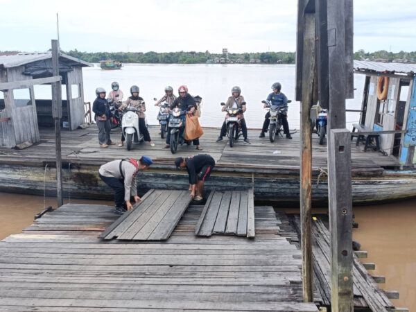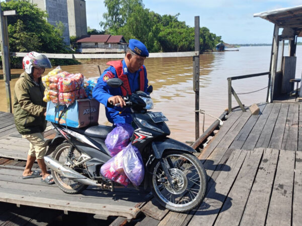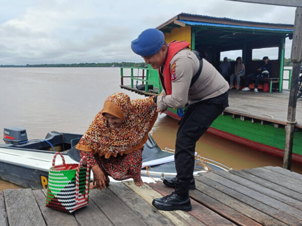 Pulang Pisau – Aksi humanis ditunjukkan oleh personel Satpolairud Polres Pulang Pisau saat menjalankan tugas pengamanan di kawasan dermaga