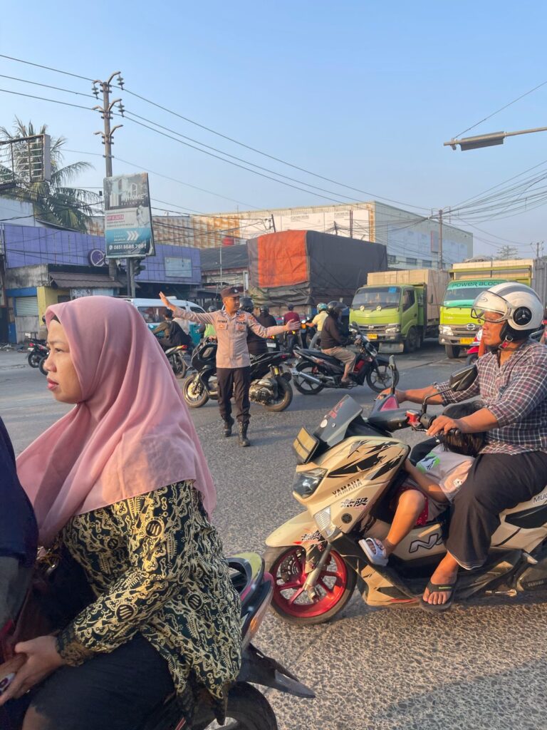 Anggota Polsek Balaraja melakukan pengaturan lalu lintas untuk membantu kelancaran kendaraan masyarakat yang lalu lalang untuk beraktifitas di Wilayah Kecamatan Balaraja.