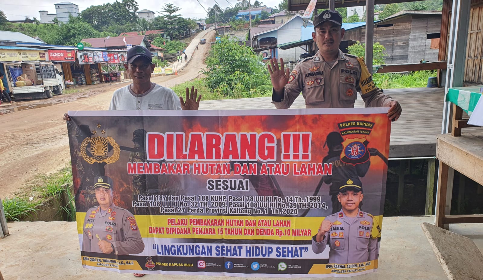 Imbauan dengan menggunakan spanduk yang berisi tentang sanksi dan pidana buka lahan dengan cara membakar, sesuai dengan pasal 187 dan pasal 188 KUHP, pasal 78 UU RI Nomor 41 Tahun 1999 tentang kehutanan, pasal 99 ayat (1), pasal 108, pasal 116, pasal 118, dan pasal 119 UU RI Nomor 32 Tahun 2009 tentang lingkungan hidup, pasal 108 UU RI Nomor 39 Tahun 2014 tentang perkebunan, pasal 27 Perda Prov. Kalteng Nomor 1 Tahun 2020 tentang pengendalian karhutla, pelaku pembakaran lahan dan hutan dapat di pidana penjara 15 Tahun dan denda 15 milyar dilaksanakan oleh personel Polsek Kapuas Hulu kepada masyarakat di Desa Sei Hanyo Kecamatan Kapuas Hulu Kabupaten Kapuas Provinsi Kalimantan Tengah.