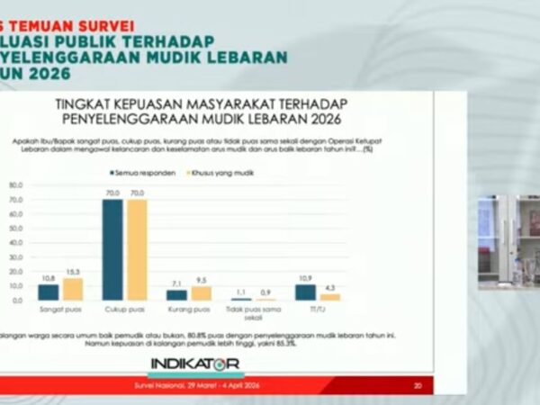 Jakarta – Indikator Politik Indonesia menyampaikan hasil survei terkait kepuasan publik terkait penyelenggaraan mudik Lebaran 2026. Total 85,3 persen