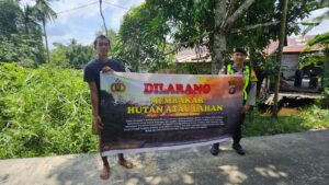 Bentang Sepanduk Larangan Membakar Hutan Dan Lahan Personil Polsek Kapuas Murung Melalui Giat Sosialisasi Karhutla
