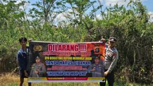 Beranda / TERKINI / Bentang Sepanduk Larangan Membakar Hutan Dan Lahan Personil Polsek Kapuas Murung Melalui Giat Sosialisasi Karhutla