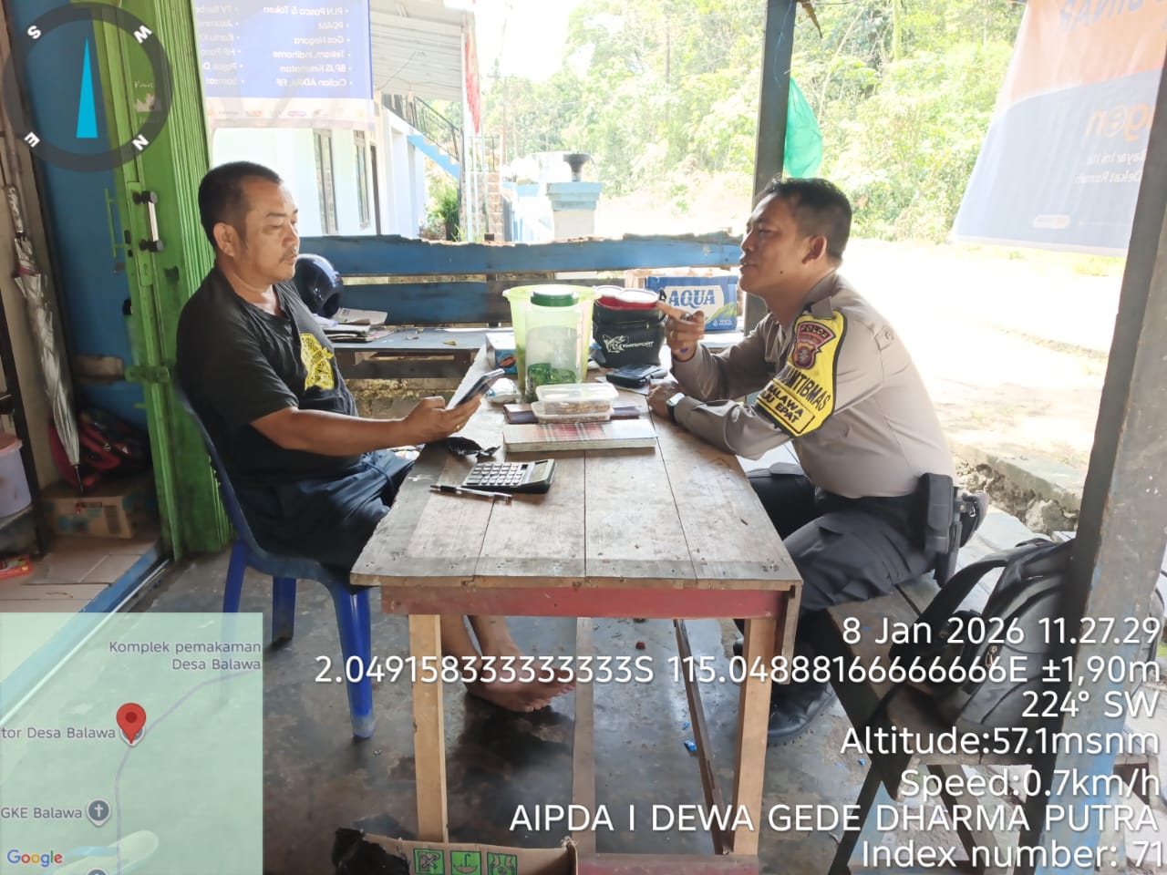 Dusun Timur, 8 Januari 2026 – Bhabinkamtibmas Desa Balawa, AIPDA I Dewa Gede Dharma Putra Atmaja, melaksanakan kegiatan Sambang Kamtibmas di Desa Balawa, Kecamatan Paju Epat, Kabupaten Barito Timur. Kegiatan ini berlangsung pada Kamis, 8 Januari 2026, dengan tujuan meningkatkan kesadaran masyarakat akan pentingnya keamanan dan ketertiban lingkungan.