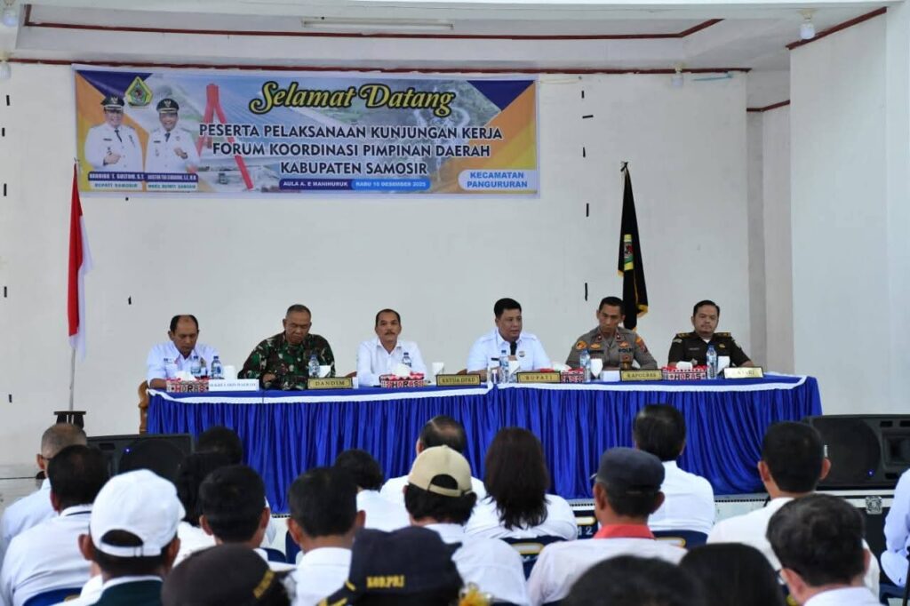 Samosir- Menjelang perayaan Natal dan Tahun Baru (Nataru), Bupati Samosir Vandiko T. Gultom mengintruksikan antisipasi menyeluruh. Ia menegaskan pentingnya kesiapsiagaan seluruh perangkat daerah dalam menghadapi potensi kerawanan di berbagai sektor. Hal ini disampaikan Bupati dalam Kunjungan Kerja Forum Koordinasi Pimpinan Daerah (Forkopimda) dengan agenda Persiapan Pengamanan Nataru bersama perangkat daerah, serta pemangku kepentingan terkait. Kegiatan akan dilakukan selama 2 hari, hari pertama (10/12) di Aula AE. Manihuruk, Kec. Pangururan dan Hari kedua (11/12) di Gedunga Aula HKBP Mogang, Kec. Palipi.