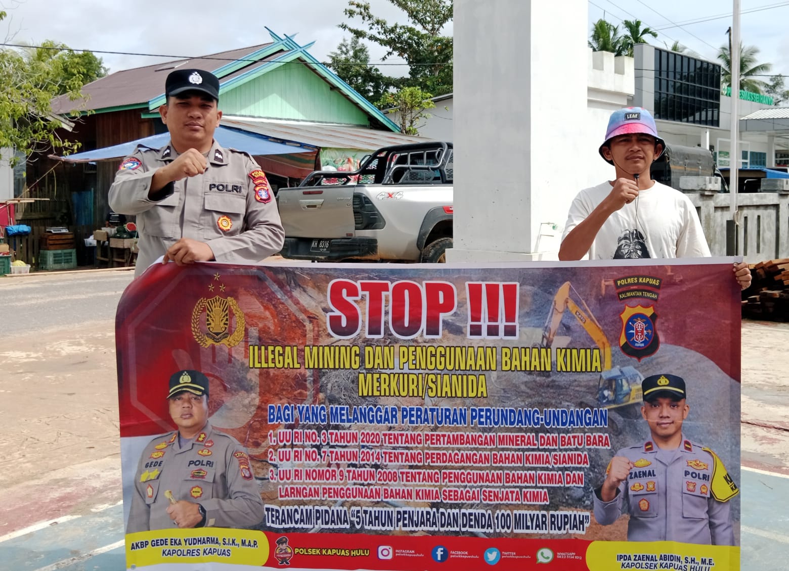 Tribratanews.kalteng.polri.go.id-Kapuas Hulu-Kegiatan sosialisasi dan imbauan kepada masyarakat dalam rangka pencegahan terjadinya kerusakan alam dengan adanya kegiatan iIlegal mining dan penggunaan bahan kimia mercuri ataupun sianida dengan mengkampanyekan larangan melakukan penambangan illegal berikut pasal, sanksi dan denda bagi pelaku penambangan illegal.