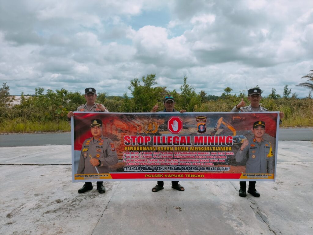 Polres Kapuas – Anggota Polsek Kapuas Tengah, Polres Kapuas, Polda Kalteng melaksanakan sosialisasi menggunakan sepanduk yang berbunyi Stop Penambangan Liar Dan Penggunaan Bahan Kimia Merkuri / Sianida, di Desa Pujon Kec. Kapuas Tengah Kab. Kapuas,Prov.Kalteng, Senin,15/09/2025.