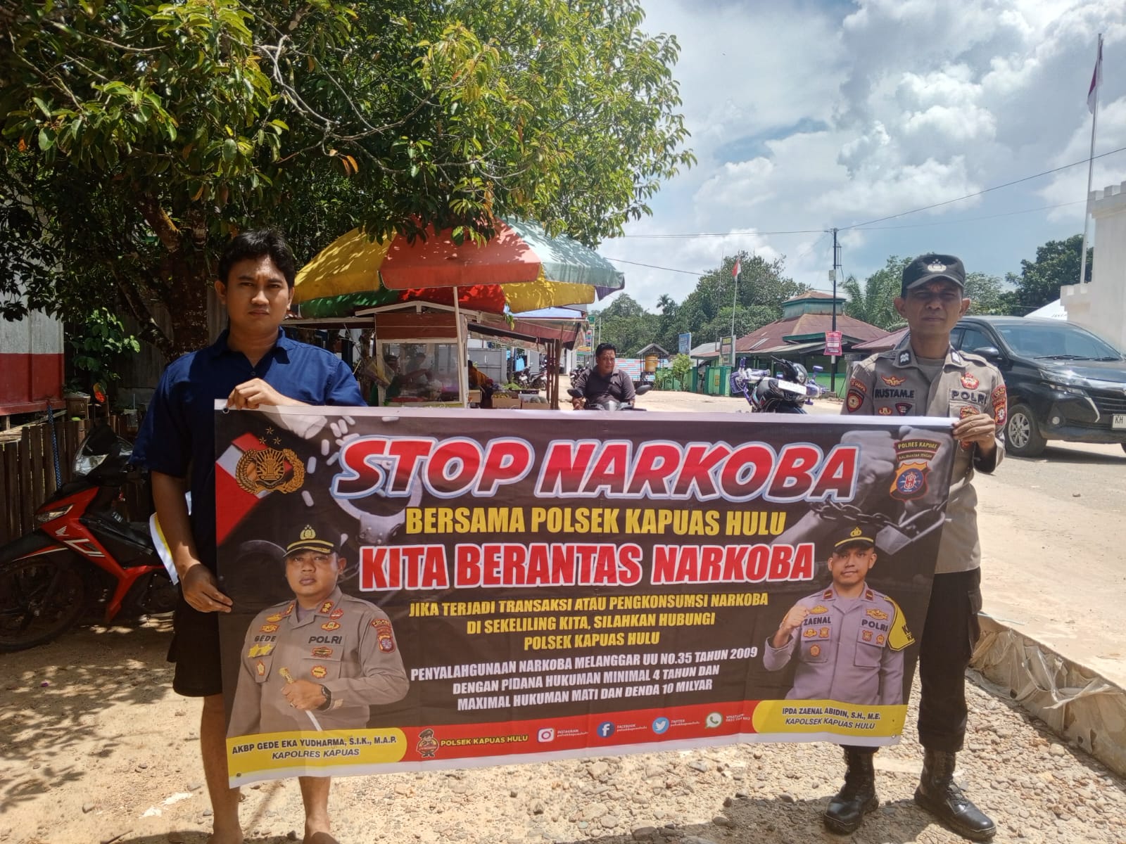 Tribratanews.kalteng.polri.go.id-Kapuas Hulu-Dalam upaya meningkatkan pencegahan dan penanggulangan penyalahgunaan narkoba, personel Polsek Timur Polres Kapuas jajaran Polda Kalteng Aiptu Rustam. E dan Aiptu Karyadi, rutin melaksanakan sosialisasi telah melaksanakan imbauan melalui media spanduk bertuliskan “Stop Narkoba” di beberapa lokasi yang dianggap rawan tindak pidana narkoba. Bertempat di Desa Sei Hanyo Kecamatan Kapuas Hulu Kapuas Hulu Kabupaten Kapuas Provinsi Kalimantan Tengah, Selasa (04/11/2025) pukul 09.25 WIB