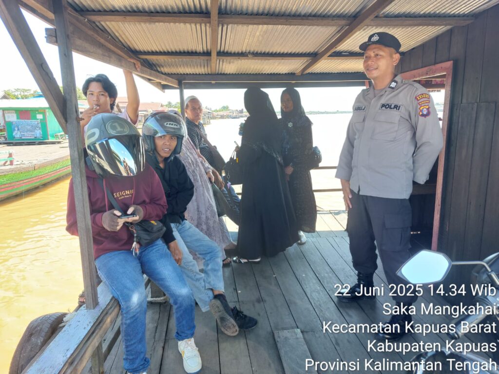 Ciptakan Rasa aman, Personil Polsek Kapuas Barat, jajaran Polres Kapuas, Polda Kalteng laksanakan kegiatan patroli dan pengaturan arus lalin di ferry penyebrangan Desa Saka Mangkahai Kec. Kapuas Barat Kab. Kapuas, Kalteng. Minggu (22/06/2025).