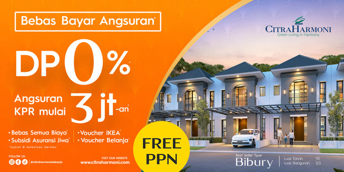Dengan mewujudkan hunian pilihan keluarga, CitraHarmoni Sidoarjo juga memberikan penawaran promo menguntungkan yaitu Free PPN hingga 170 juta, DP 0%, subsidi bunga 2%, subsidi asuransi jiwa, bebas biaya KPR, BPHTB, AJB, BBN, serta bonus voucher IKEA, smart door lock, kanopi, tandon, taman belakang, dan CCTV.Miliki tipe Bibury sekarang di CitraHarmoni Sidoarjo, beserta promo menariknya! Kunjungi link berikut untuk informasi lebih lanjut!