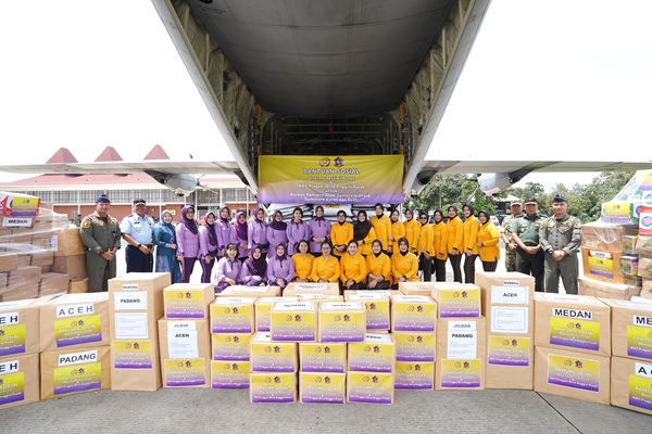 Jakarta – Ketua Umum Dharma Pertiwi sekaligus Ketua Umum IKKT Pragati Wira Anggini Ny. Evi Agus Subiyanto didampingi oleh Ketua Harian Dharma Pertiwi Ny. Susi Tandyo Budi R dan Ketua Harian IKKT PWA Ny. Selly Richard Tampubolon beserta pengurus pusat menyerahkan bantuan untuk didistribusikan kepada masyarakat terdampak bencana di Sumatera, Halim Perdanakusuma, Senin (8/12/2025).