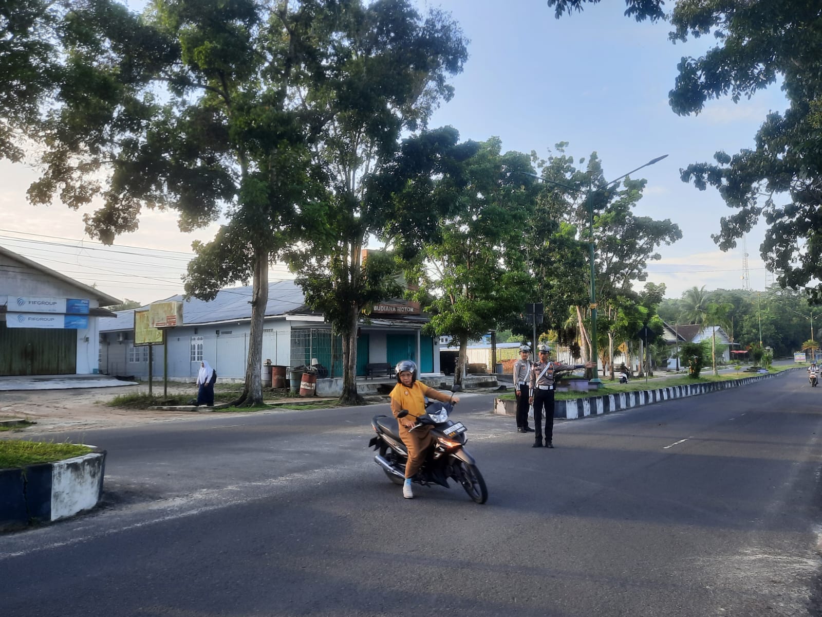 Petugas secara sigap mengatur laju kendaraan di persimpangan jalan agar tidak terjadi penumpukan yang dapat memicu kecelakaan. Selain mengatur arus, personel juga membantu warga yang mengalami kendala di jalan, sehingga situasi arus lalu lintas tetap terjaga dengan aman dan tertib selama jam sibuk berlangsung di pagi hari.