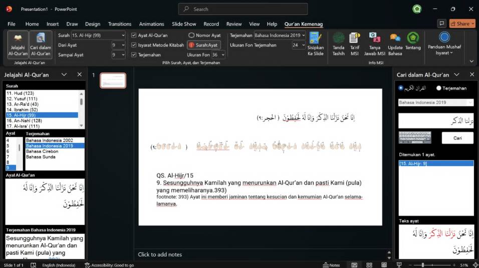 “Add-ins ini menjadi solusi agar pengutipan ayat lebih rapi, akurat, dan sahih, khususnya untuk kebutuhan presentasi pembelajaran maupun dakwah,” ujarnya.