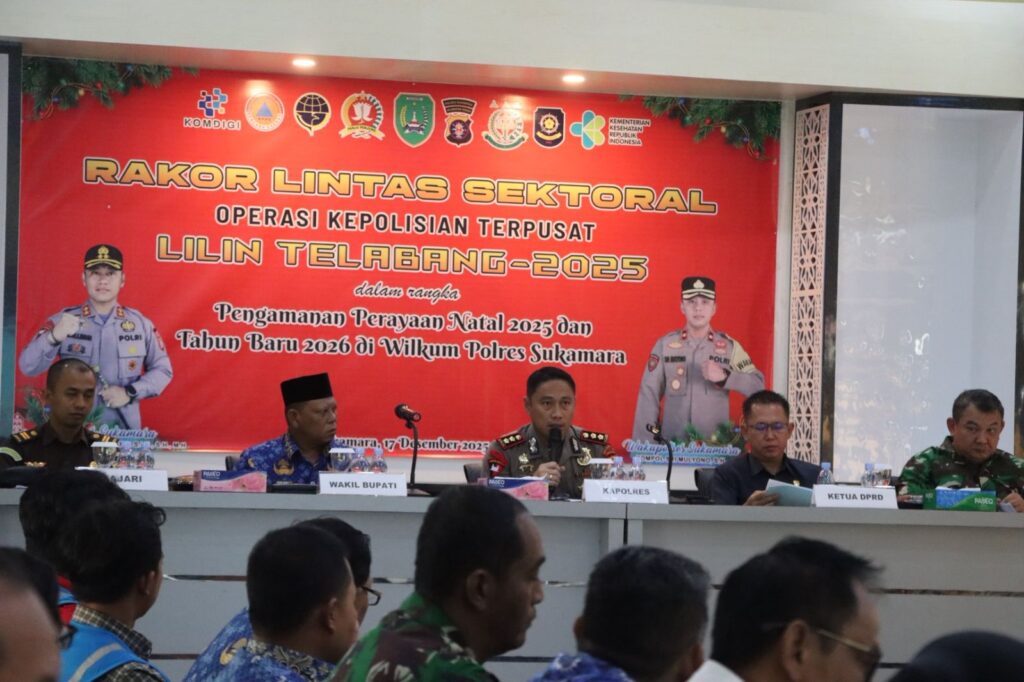 Sukamara – Polres Sukamara bersama unsur Forkopimda menggelar Rapat Koordinasi Lintas Sektoral dalam rangka kesiapan pelaksanaan Operasi Lilin Telabang 2025, pengamanan Natal 2025, serta Tahun Baru 2026 di wilayah Kabupaten Sukamara. Kegiatan ini dilaksanakan di Aula Satya Haprabu Polres Sukamara, Rabu (17/12/2025) pagi.