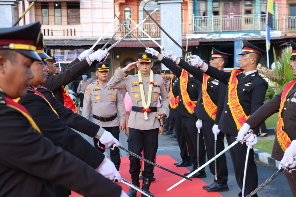 Setelah berpamitan, tradisi pedang Pora pun kembali dilakukan untuk melepas AKBP Faisal menuju lokasi Dinas kerja yang baru.