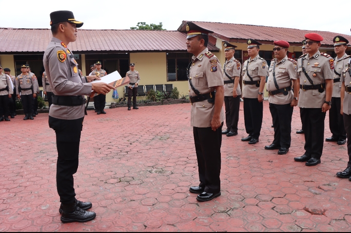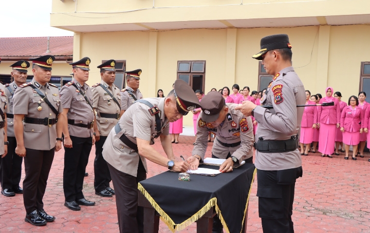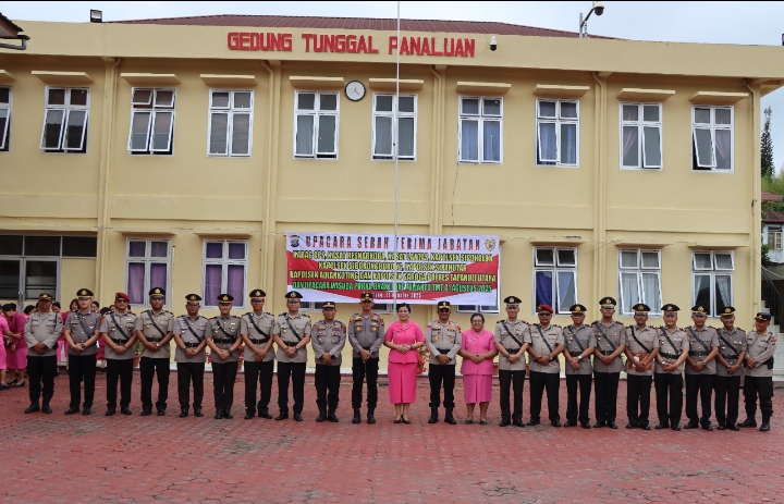 Kepala kepolisian resort Tapanuli Utara AKBP Ernis Sitinjak, SH, S.I.K, pimpin serah terima jabatan 8 perwira polres Taput, Jumat ( 1/8/2025).