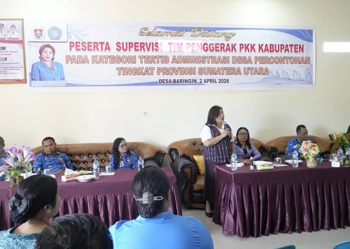 Ketua TP PKK Kabupaten Humbang Hasundutan Ny. Erma Oloan P. Nababan melaksanakan kegiatan supervisi dalam rangka penilaian kategori tertib administrasi desa percontohan tingkat Provinsi Sumatera Utara yang dilaksanakan di Rumah Dilan, Desa Baringin, Kamis 2 April 2026. Turut hadir Kadis Parpora Dina VWO Simamora, Perwakilan OPD, TP PKK Kabupaten, Camat Parlilitan Marolop Sihotang, Kepala Desa Baringin Hotmauli Sitohang, TP PKK Kecamatan dan Desa, Perangkat Desa dan lainnya.