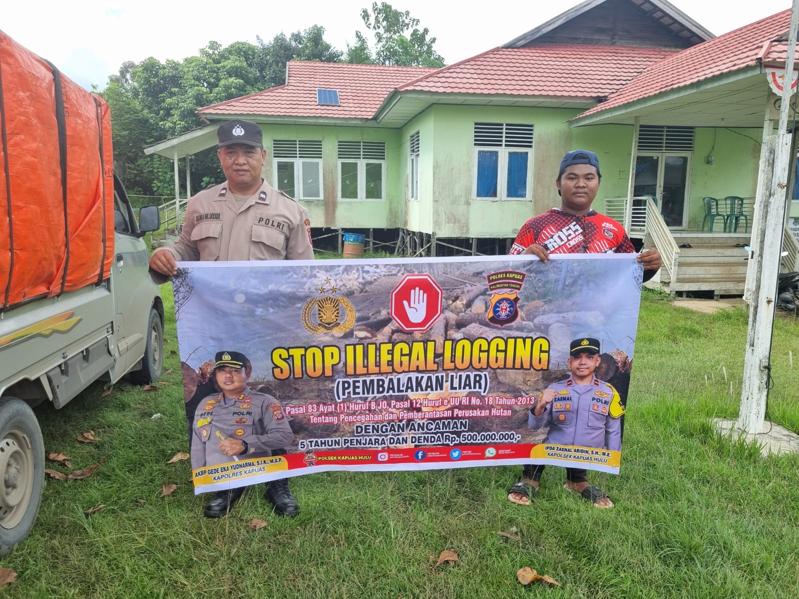 Tribratanews.kalteng.polri.go.id-Kapuas Hulu-Personil Polsek Kapuas Hulu, jajaran Polres Kapuas, Polda Kalimantan Tengah Aiptu Rama Wijayadi dan Brigpol Beni. S, S.H., dalam rangka mencegah terjadinya pembalakan hutan pihaknya rutin melakukan sosialisasi tentang illegal logging kepada masyarakat Desa Sei Hanyo Kec. Kapuas Hulu Kab. Kapuas Prov. Kalteng, Kamis (06/11/2025) pukul 09.20 Wib.