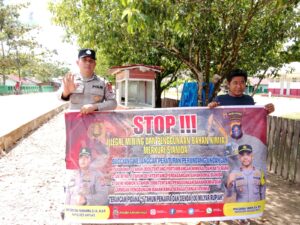 “Personel Polsek Kapuas Hulu membentangkan spanduk bertuliskan stop illegal mining serta sanksi pidana RI nomor 3 tahun 2020 tentang pertambangan mineral dan batubara, undang-undang RI nomor 7 tahun 2014 tentang perdagangan bahan kimia/sianida, dan undang-undang RI nomor 9 tahun 2008 tentang penggunaan bahan kimia sebagai senjata kimia dengan ancaman pidana penjara selama 5 tahun dan denda 100 milyar rupiah serta memberikan himbauan bersama-sama dalam menanggulangi illegal mining apabila mendengar, melihat suatu kegiatan penambangan iIlegal agar segera melaporkannya ke Polsek Kapuas Hulu atau bisa melaporkannya kepada Bhabinkamtibmas atau Polmas untuk segera di tindak lanjuti”. tegas Kapolsek. (@13)