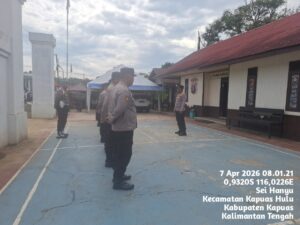 Apel pagi kali ini dipimpin oleh Kapolsek Kapuas Hulu Ipda Zaenal Abidin, S.H., M.E., bersama personel Polsek Kapuas Hulu dilaksanakan dalam rangka antisipasi perkembangan sitkamtibmas di wilayah hukum Polsek Kapuas Hulu jajaran Polres Kapuas Polda Kalteng di halaman mako Polsek Kapuas Hulu, Selasa (07/04/2026) pukul 08.00 Wib