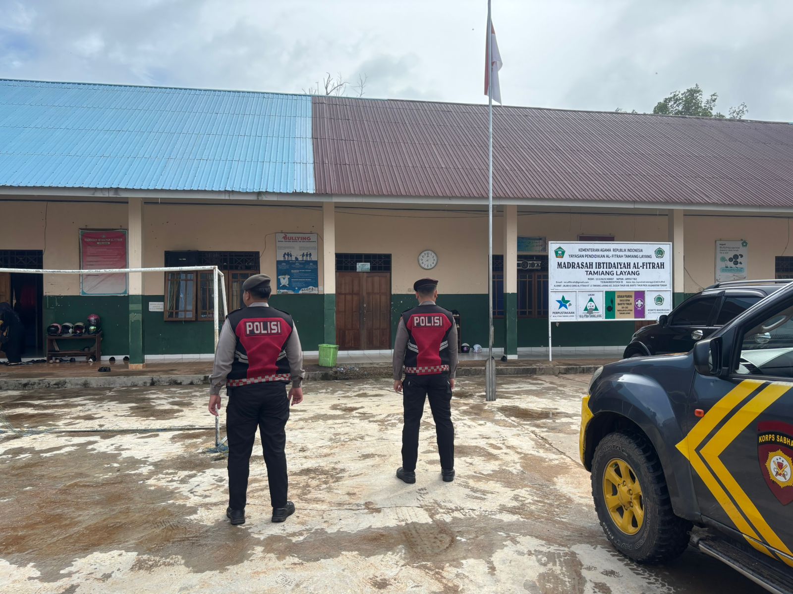 Patroli selanjutnya menyasar lingkungan fasilitas pendidikan Madrasah Ibtidaiyah Al-Fitrah di Jalan Empat Lima, Kelurahan Tamiang Layang, Kecamatan Dusun Timur. Personel melakukan observasi lingkungan dan dialog dengan pihak terkait. Situasi di sekitar area pendidikan terpantau aman dan kondusif.