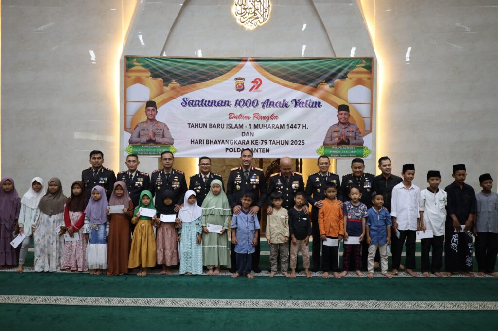Serang – analisnews.co.id Dalam rangkaian kegiatan memperingati Hari Bhayangkara ke-79 Tahun 2025, Kapolda Banten Irjen Pol Suyudi Ario Seto Bersama Wakapolda Banten Brigjen Pol H. Hengki didampingi PJU Polda Banten menunjukkan wujud nyata kepedulian sosial dengan memberikan santunan berupa bingkisan kepada 1000 anak yatim piatu yang berasal dari berbagai wilayah di Provinsi Banten. Kegiatan santunan ini berlangsung di Masjid Baiturrahman Polda Banten pada Selasa (01/07).