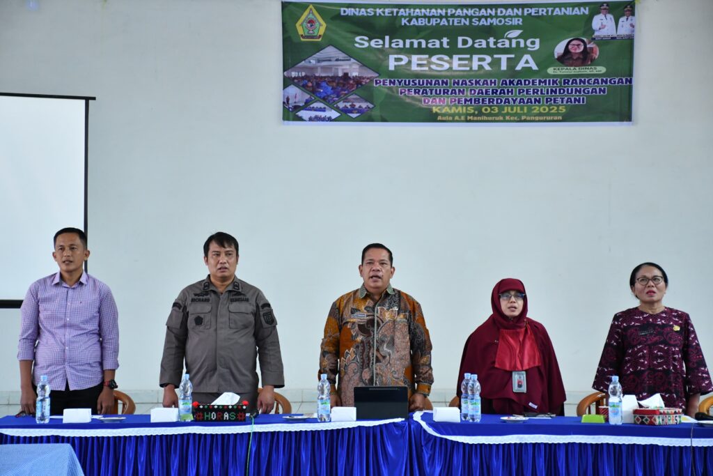Samosir- Pemkab Samosir melalui Dinas Ketahanan Pangan dan Pertanian menggelar rapat lanjutan penyusunan Naskah Akademik Rancangan Peraturan Daerah Tentang Perlindungan dan Pemberdayaan Petani. Kegiatan ini dibuka oleh Bupati Samosir diwakili Asisten II Hotraja Sitanggang, ST, MM di Aula AE. Manihuruk, Desa Lumban Suhisuhi Toruan, Kecamatan Pangururan, Kamis (3/7).