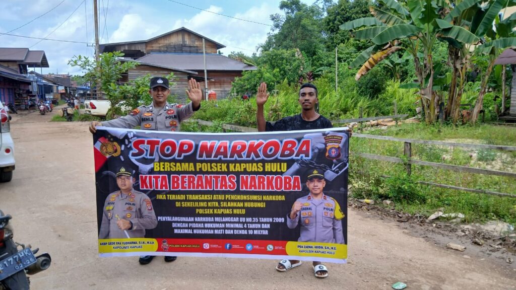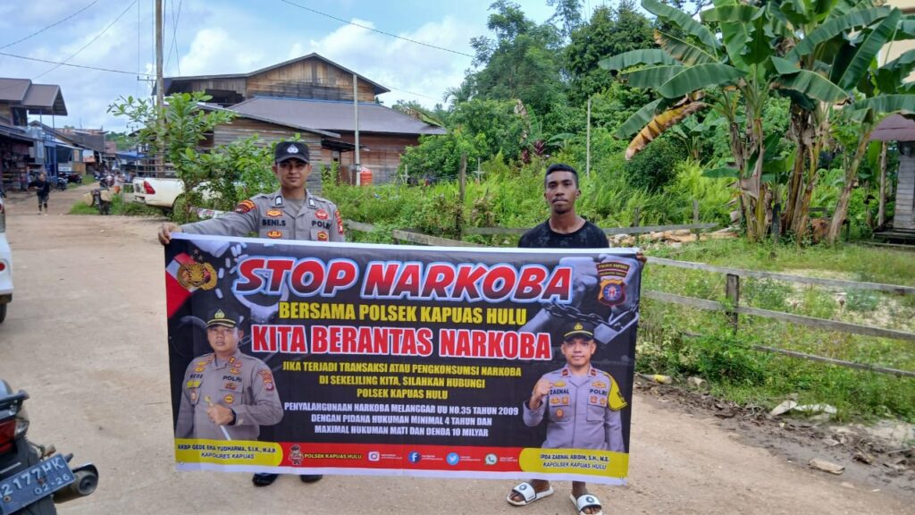 Tribratanews.kalteng.polri.go.id-Kapuas Hulu-Dalam upaya meningkatkan kesadaran masyarakat terhadap bahaya narkoba, Polsek Kapuas Hulu Polres Kapuas Polda Kalteng melakukan kegiatan imbauan bahaya narkoba melalui media spanduk di berbagai tempat umum yang ada di wilayah Kecamatan Kapuas Hulu, Kabupaten Kapuas Provinsi Kalimantan Tengah, Selasa (17/06/2025) pukul 11.30 WIb.