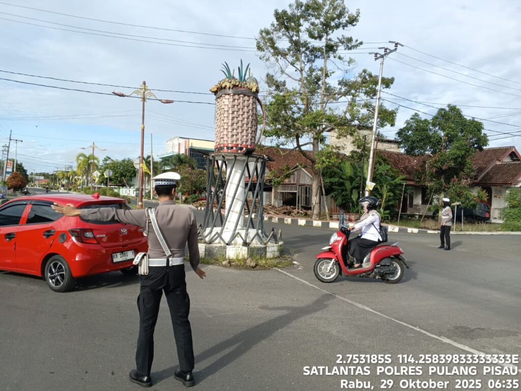 PULANG PISAU – Dalam upaya mewujudkan pelayanan prima dan menciptakan keamanan, keselamatan, ketertiban, dan kelancaran lalu lintas (Kamseltibcarlantas), personel Satuan Lalu Lintas (Satlantas) Polres Pulang Pisau rutin melaksanakan kegiatan pengaturan lalu lintas (gatur lalin) di sejumlah persimpangan jalan utama Kota Pulang Pisau. Kegiatan yang berlangsung pada Rabu (29/10/2025) pagi ini merupakan bagian integral dari program unggulan “Polantas Menyapa.”