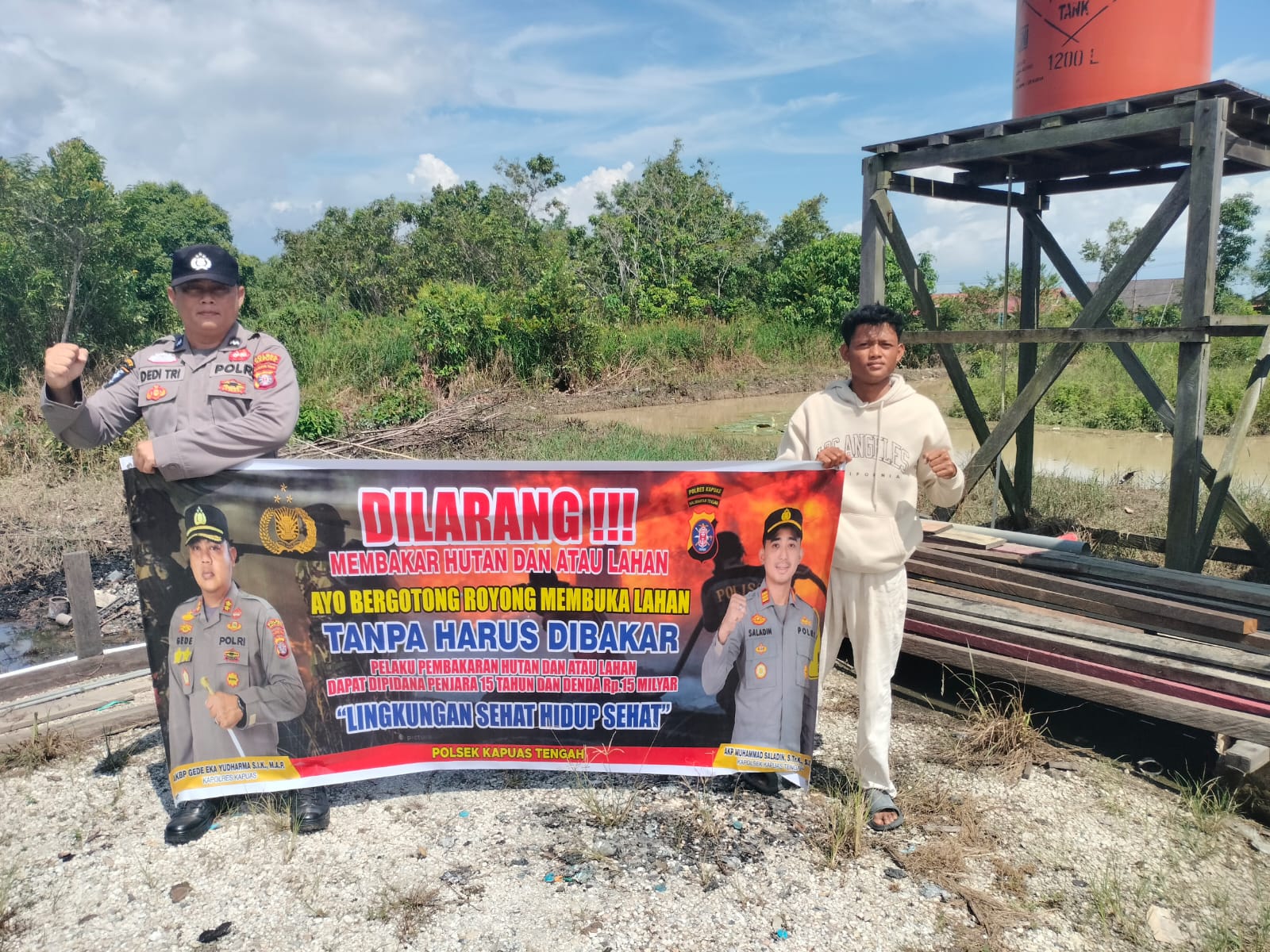 Tribratanews.kalteng.polri.go.id – Polsek Kapuas tengah jajaran Polres Kapuas Polda Kalteng,Kamis,23/04/2026) , Polsek Kapuas Tengah jajaran Polres Kapuas Provinsi Kalimanatan Tengah telah melaksanakan Kegiatan Sosialisasi Larangan Karhutla dengan spanduk dan Maklumat Kapolda Kalteng tentang Sangsi dan Pidana buka lahan dengan cara membakar, sesuai dengan Pasal 187,188 KUHP, Pasal 78 UU No. 14 Th. 1999, Pasal 108 UU No. 39 Th. 2014, dan Pasal 25 Perda Kalteng No. 5 Th. 2003 Dengan ancaman Pidana 15 Tahun dan denda 15 Milyar.