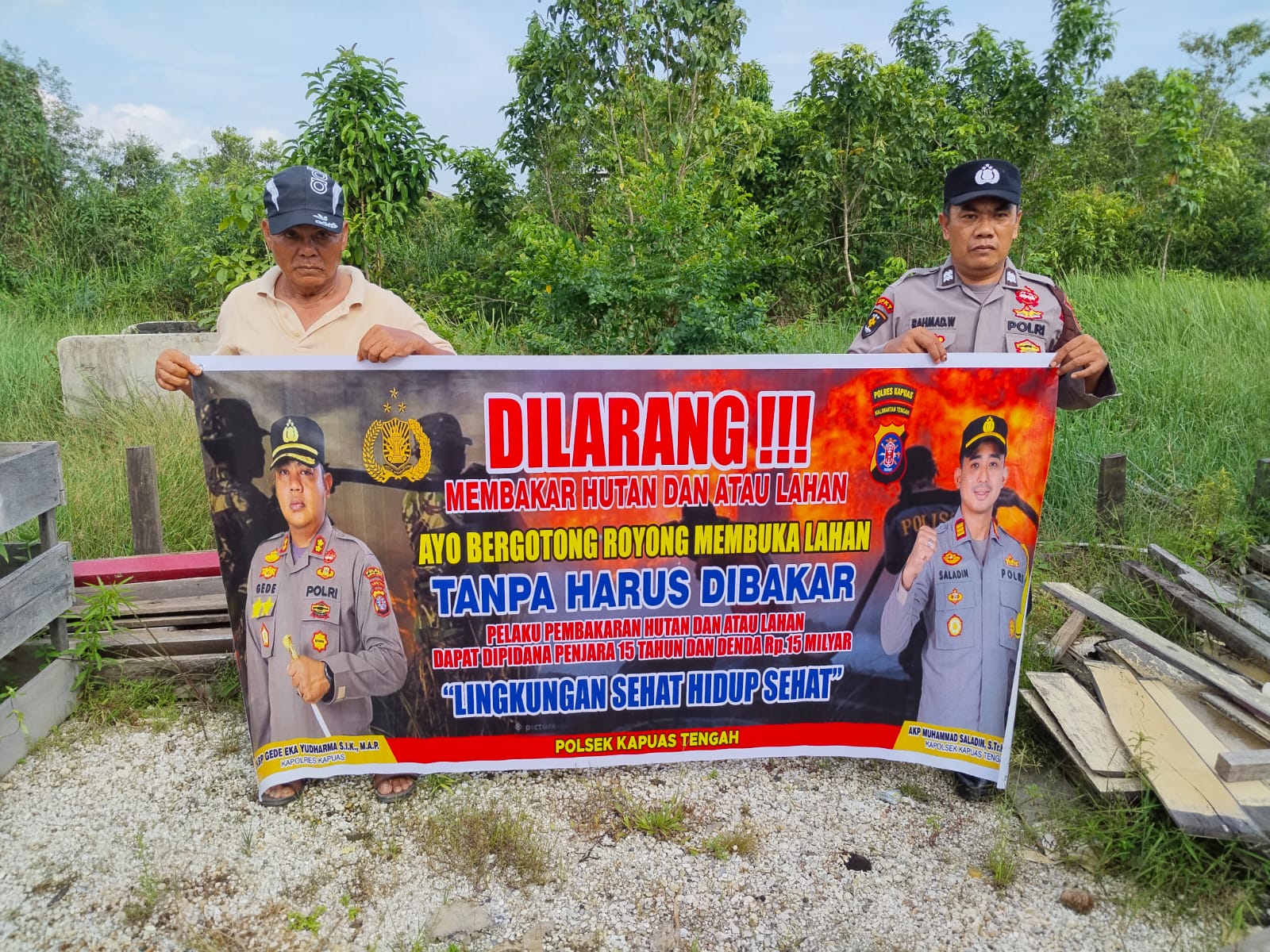 Tribratanews.kalteng.polri.go.id – Polsek Kapuas tengah jajaran Polres Kapuas Polda Kalteng,Sabtu,04/04/2026) , Polsek Kapuas Tengah jajaran Polres Kapuas Provinsi Kalimanatan Tengah telah melaksanakan Kegiatan Sosialisasi Larangan Karhutla dengan spanduk dan Maklumat Kapolda Kalteng tentang Sangsi dan Pidana buka lahan dengan cara membakar, sesuai dengan Pasal 187,188 KUHP, Pasal 78 UU No. 14 Th. 1999, Pasal 108 UU No. 39 Th. 2014, dan Pasal 25 Perda Kalteng No. 5 Th. 2003 Dengan ancaman Pidana 15 Tahun dan denda 15 Milyar.