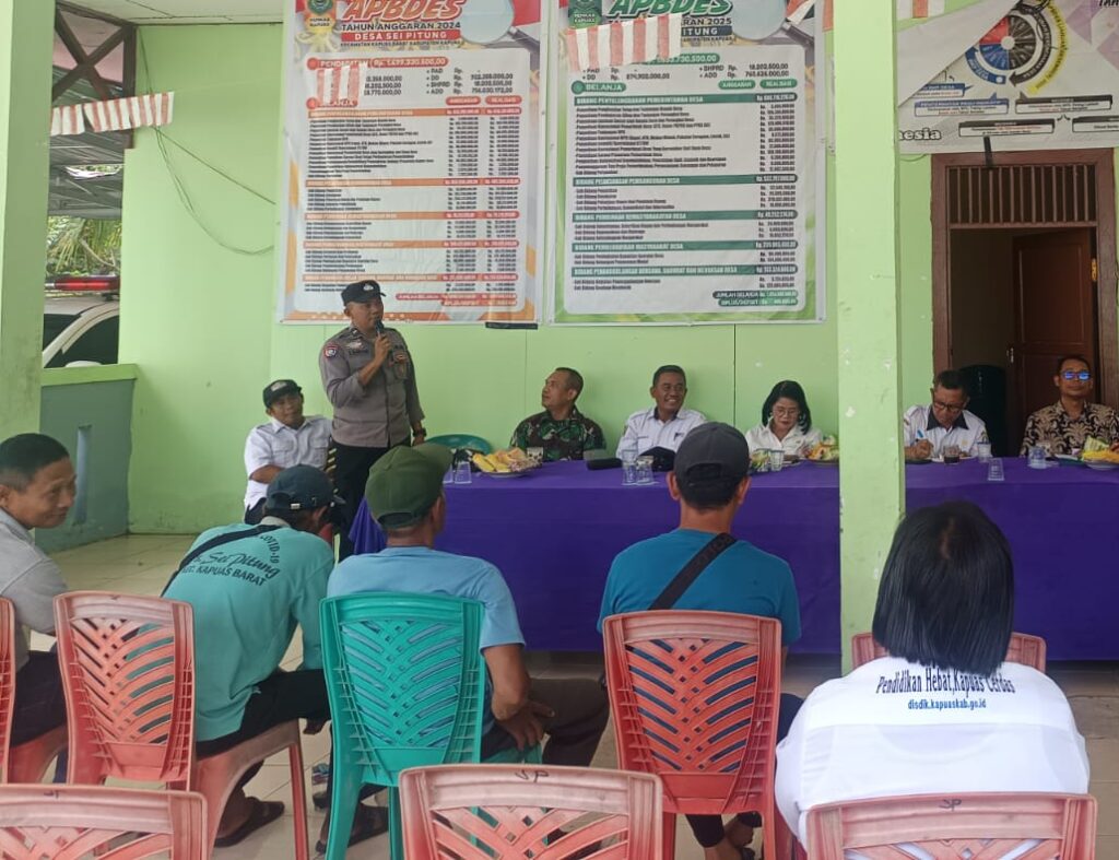 Petugas Polmas Polsek Kapuas Barat Polres Kapuas Desa Sei Pitung Kec. Kapuas Barat Aipda Eko Suryan menghadiri kegiatan Musyawarah Desa Khusus terkait Koperasi Desa Merah Putih bertempat aula Balai Desa Sei Pitung Kecamatan Kapuas Barat Kabupaten Kapuas. Rabu (29/10/2025).
