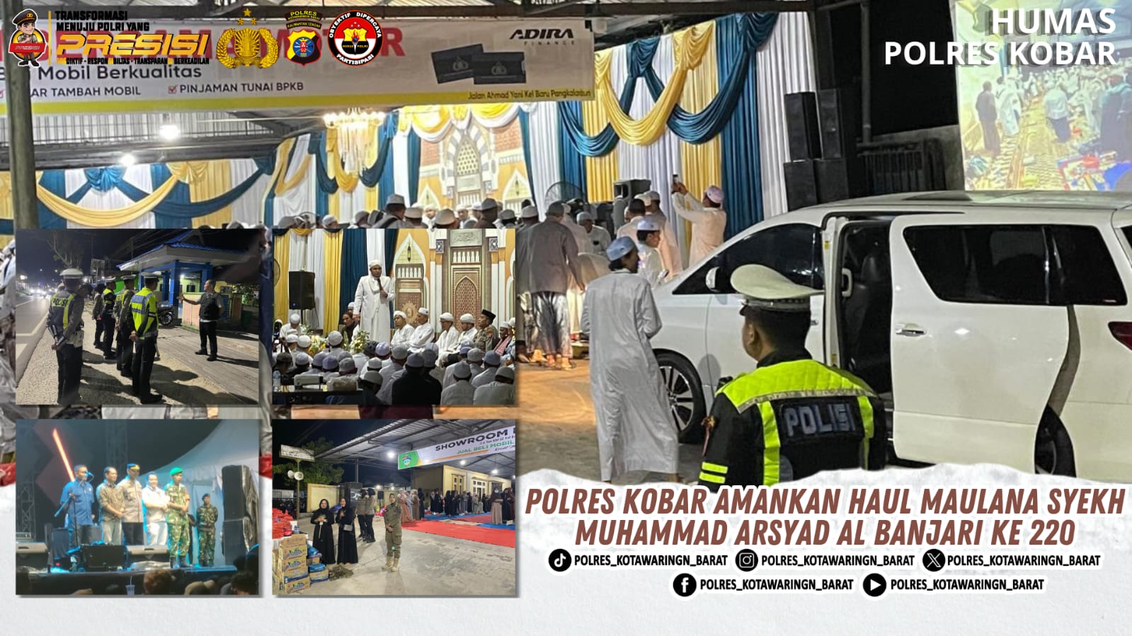 ‎Polres Kobar – Polres Kotawaringin Barat melaksanakan pengamanan Kegiatan Haul Maulana Syekh Muhammad Arsyad Al Banjari Ke 220 Dan H. Salman Bin Abdul Majid Ke 3 di Showroom Bersama (H. Muhammad IPul) Jl. A. Yani, Kab. Kotawaringin Barat, Sabtu (04/04/2026) malam. Kegiatan ini dihadiri sekitar 1.500 jamaah dari berbagai daerah.