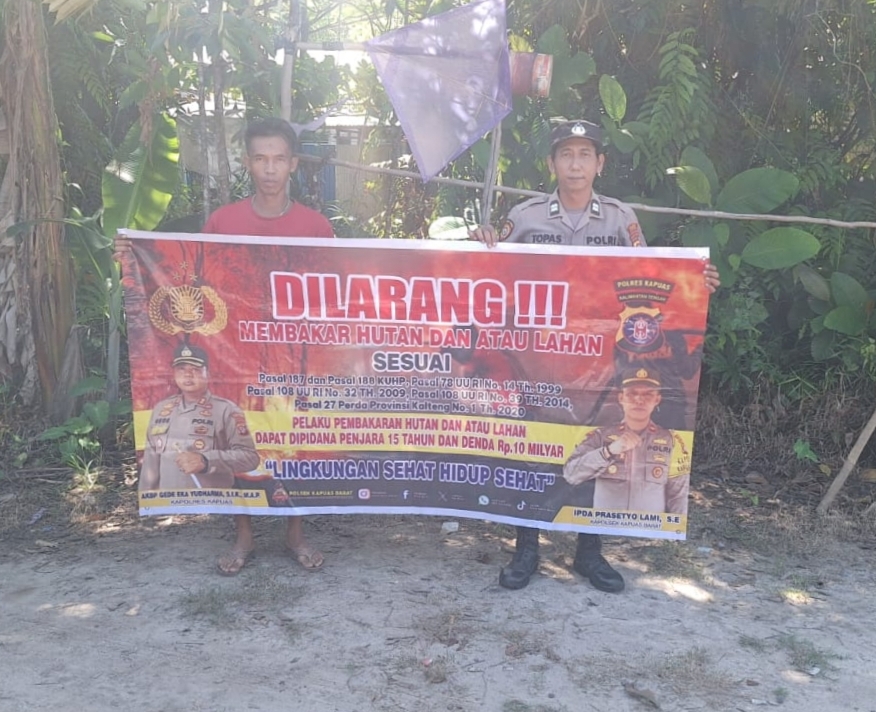 Pada hari Senin, tanggal 3 November 2025, pukul 12.30 WIB, dua personel Polsek Kapuas Barat, yakni Aiptu Topas T.R dan Bripka Misrani, melaksanakan kegiatan himbauan pencegahan kebakaran hutan dan lahan (Karhutla) di wilayah hukum Polsek Kapuas Barat, Kecamatan Kapuas Barat, Kabupaten Kapuas, Provinsi Kalimantan Tengah. Kegiatan ini dilakukan sebagai bagian dari upaya Polsek Kapuas Barat dalam mengantisipasi potensi terjadinya Karhutla menjelang musim kemarau.