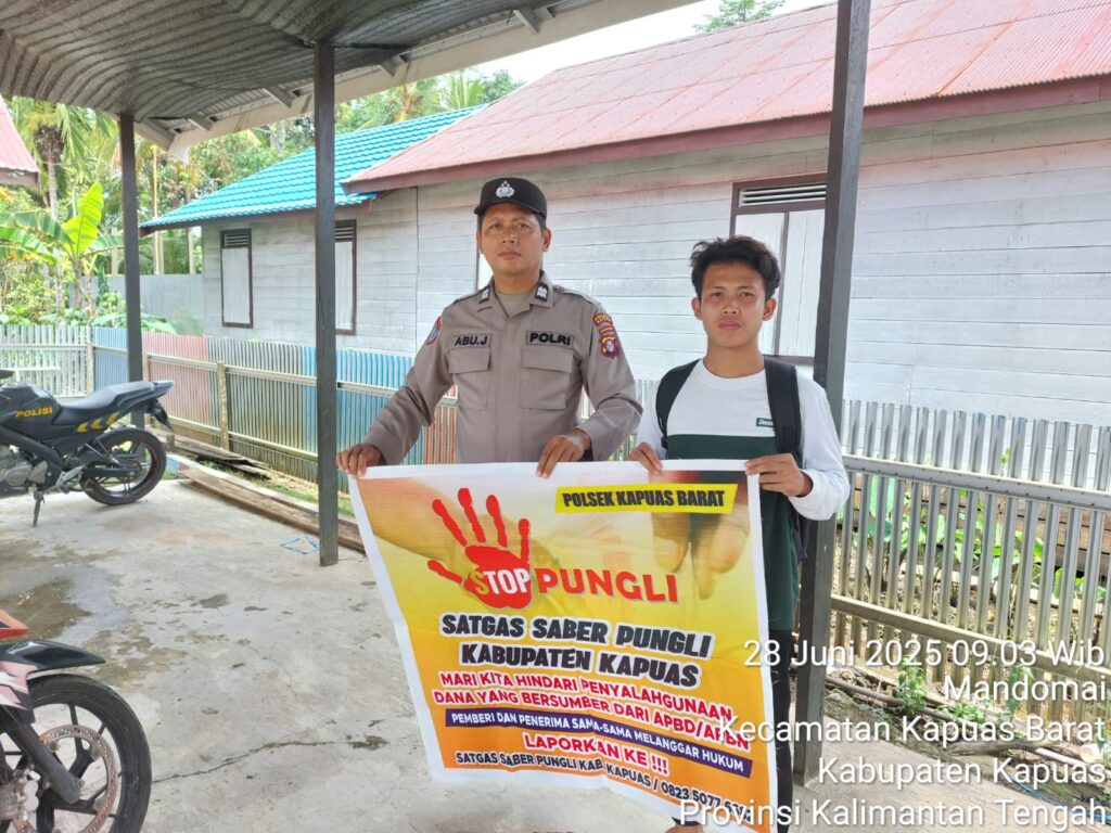Personel Polsek Kapuas Barat Polres Kapuas Aiptu Abu. J melaksanakan sosialisasi Saber Pungli kepada warga masyarakat pada Sabtu (28/06/2025).