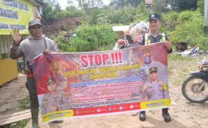 Tribratanews.kalteng.polri.go.id-Kapuas Hulu-Personel Polsek Kapuas Hulu Polres Kapuas Jajaran Polda Kalteng, personel Polsek Kapuas Hulu Aipda Imanuel P. Nadeak dan Aiptu Karyadi, S.Sos, dengan menggunakan spanduk yang berbunyi Stop Penambangan Liar Dan Penggunaan Bahan Kimia Merkuri melakukan sosialisasi di Desa Sei Hanyo Kecamatan Kapuas Hulu Kapuas Hulu Kabupaten Kapuas Provinsi Kalimantan Tengah, Rabu (01/04/2026) pukul 10.00 Wib.