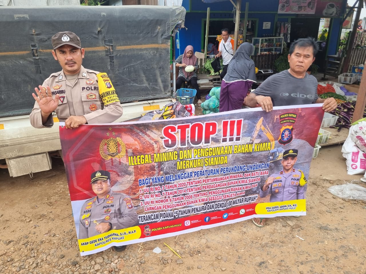 Tribratanews.kalteng.polri.go.id-Kapuas Hulu-Personel Polsek Kapuas Hulu Polres Kapuas Jajaran Polda Kalteng, personel Polsek Kapuas Hulu Aiptu Sudono dan Brigpol A. Pasaribu, dengan menggunakan spanduk yang berbunyi Stop Penambangan Liar Dan Penggunaan Bahan Kimia Merkuri melakukan sosialisasi di Desa Sei Hanyo Kecamatan Kapuas Hulu Kapuas Hulu Kabupaten Kapuas Provinsi Kalimantan Tengah, Rabu (14/01/2026) pukul 10.25 Wib.