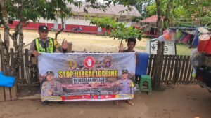 “Melalui spanduk ini, kami mengajak masyarakat untuk tidak melakukan pembalakan liar sesuai Pasal 83 ayat (1) huruf B Jo, Pasal 12 huruf e UU RI no. 18 tahun 2013 tentang pencegahan dan pemberantasan perusakan hutan, dengan ancaman 5 tahun penjara dan denda Rp500.000.000 (lima ratus juta rupiah),” terangnya.