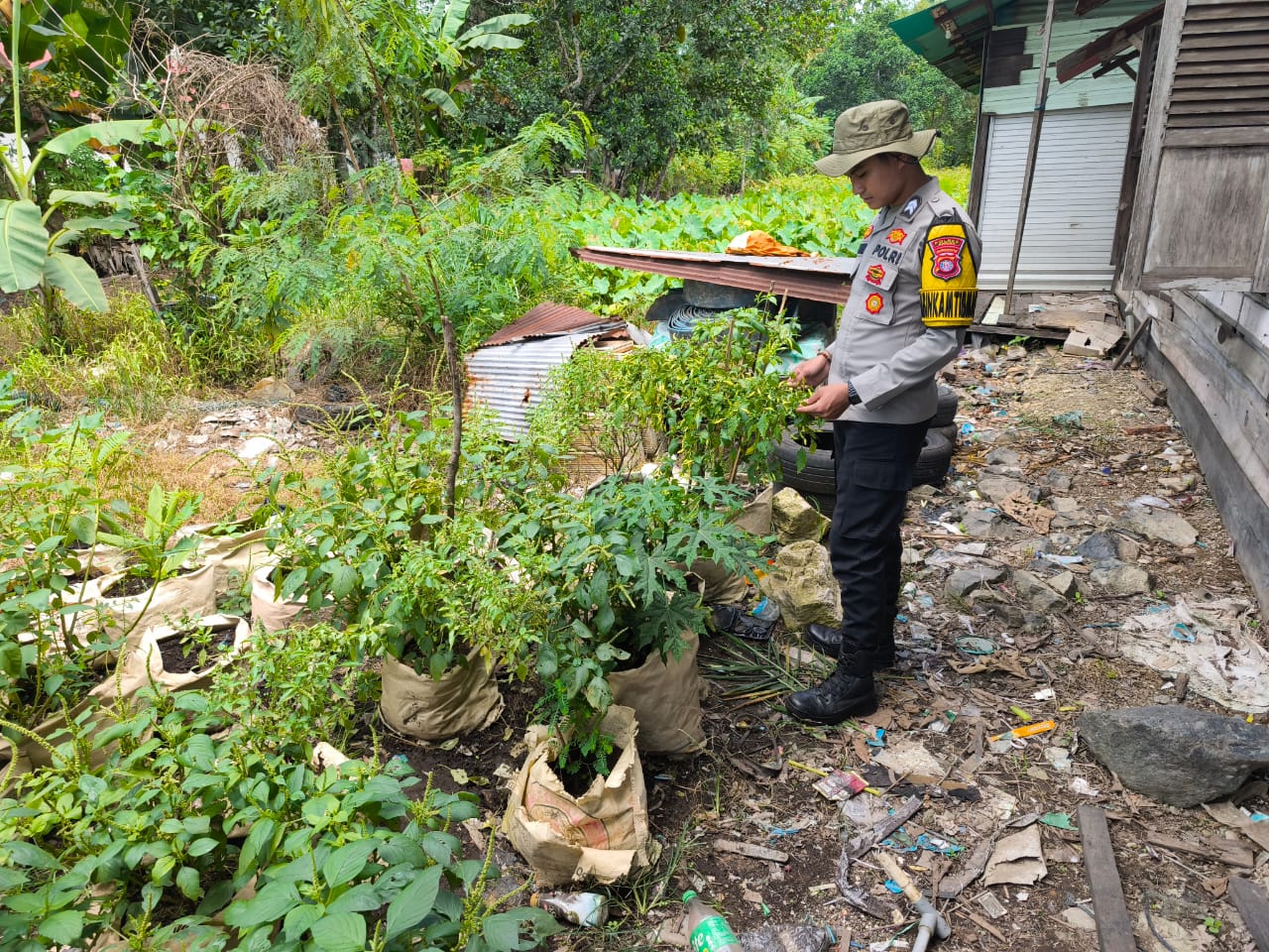 Kapuas Timur-Dalam upaya mendukung program ketahanan pangan yang digagas oleh Presiden Republik Indonesia, H. Prabowo Subianto, Kapolsek Kapuas Timur yang diwakili oleh Bhabinkamtibmas Briptu M. Maslan Alkarni bersama pemilik lahan Sdr. Sulaiman, melaksanakan peninjauan lokasi pemanfaatan lahan pekarangan berupata tanaman pangan jenis kacang panjang seluas 6X50 M² yang dikelola secara mandiri di Handel Habib Km. 8 Desa Anjir Serapat Baru Kec. Kapuas Timur Kab. Kapuas, Rabu (29/10/2025).