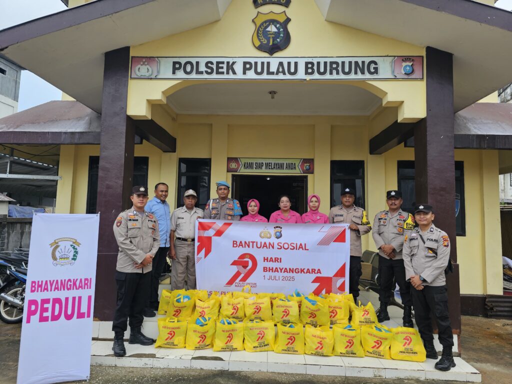 Pulau Burung – Memperingati Hari Ulang Tahun (HUT) Bhayangkara ke-79, Kepolisian Sektor (Polsek) Pulau Burung membagikan 35 paket bantuan sosial (bansos) kepada warga kurang mampu di wilayah hukumnya. Kegiatan ini merupakan bentuk kepedulian Polri terhadap masyarakat, khususnya di tengah tantangan ekonomi saat ini.