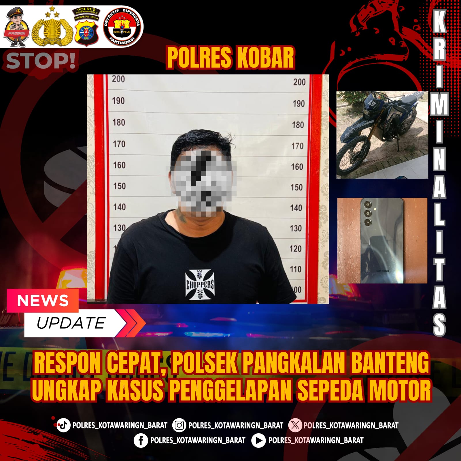 Polres Kobar – Polsek Pangkalan Banteng jajaran Polres Kobar berhasil mengungkap kasus tindak pidana penggelapan sepeda motor yang terjadi pada Jumat (27/03/2026) di BTN Residence Pangkalan Banteng, Desa Karang Mulya.