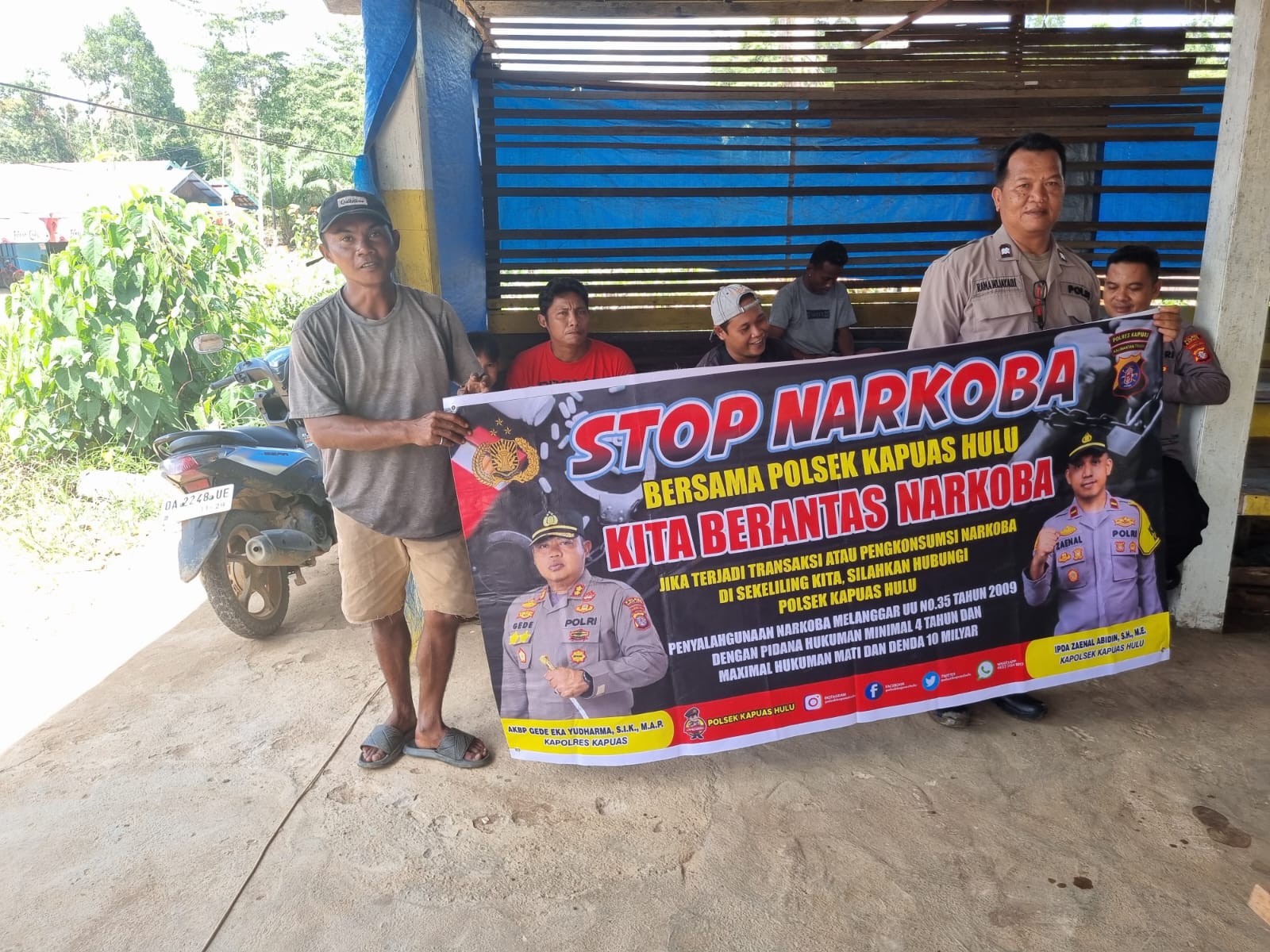 Tribratanews.kalteng.polri.go.id-Kapuas Hulu-Dalam upaya pemberantasan penyakit masyarakat terutama penyalahgunaan narkoba, Polsek Kapuas Hulu Polres Kapuas Polda Kalteng melakukan imbauan melalui media spanduk peringatan keras bagi pengedar dan pemakai narkoba oleh personel Polsek Kapuas Hulu Aiptu Rama Wijayadi dan Brigpol A. Pasaribu, bertempat di Desa Sei Hanyo Kecamatan Kapuas Hulu Kabupaten Kapuas Prov. Kalteng, Minggu (11/01/2026) pukul 11.20 Wib.
