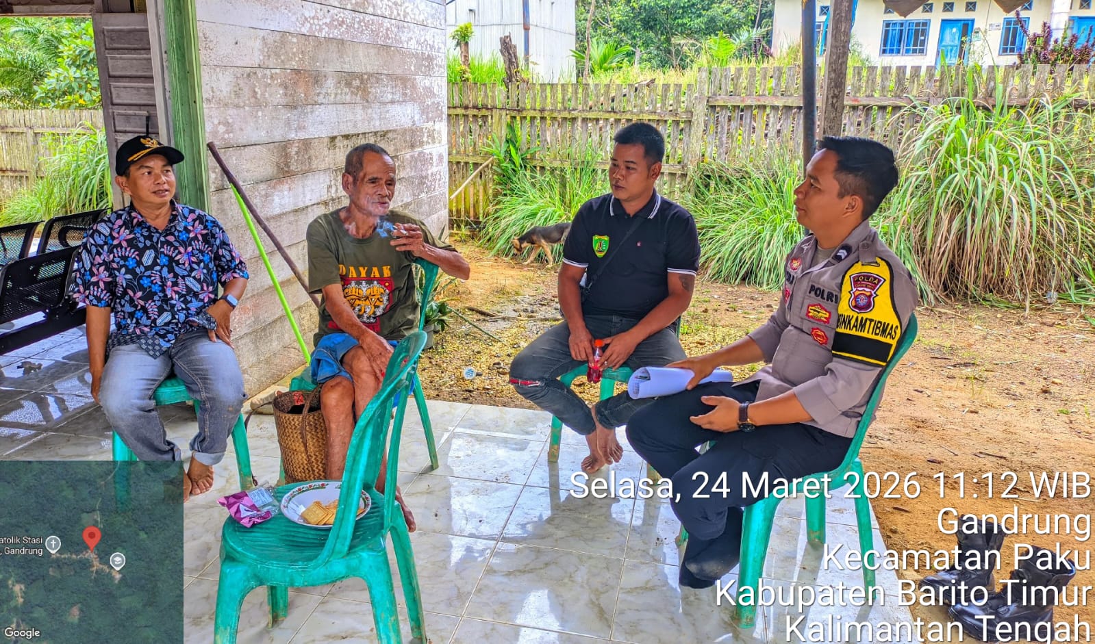 Paku, Dalam rangka menjaga stabilitas keamanan dan ketertiban masyarakat (kamtibmas), Bhabinkamtibmas Desa Gandrung, Kecamatan Paku, Kabupaten Barito Timur, BRIPTU Mino Kristianto melaksanakan kegiatan sambang kepada warga di RT 01, Selasa (24/3/2026).