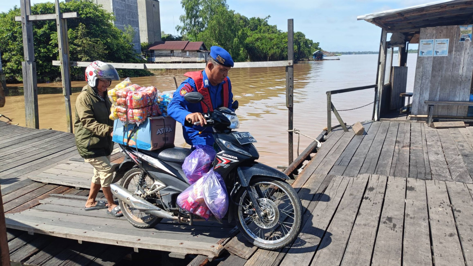 Pantauan di lokasi menunjukkan kondisi dermaga yang cukup padat. Salah seorang pengendara motor tampak kewalahan menyeimbangkan kendaraannya karena membawa muatan barang yang cukup banyak. Melihat hal tersebut, anggota Satpolairud Polres Pulang Pisau yang sedang bertugas langsung sigap membantu mendorong dan menjaga keseimbangan motor hingga naik ke atas ramp door kapal dengan aman.