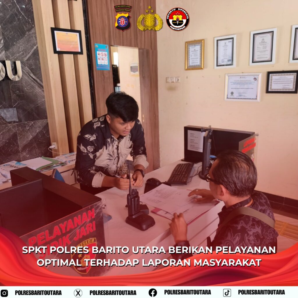 Petugas SPKT Polres Barito Utara memberikan pelayanan cepat, ramah, dan profesional kepada masyarakat yang datang untuk melaporkan berbagai peristiwa, baik terkait tindak pidana maupun pengaduan umum. Hal ini merupakan wujud komitmen Polres Barito Utara dalam mendukung program Presisi Polri yang menekankan pelayanan prima, transparan, dan akuntabel.