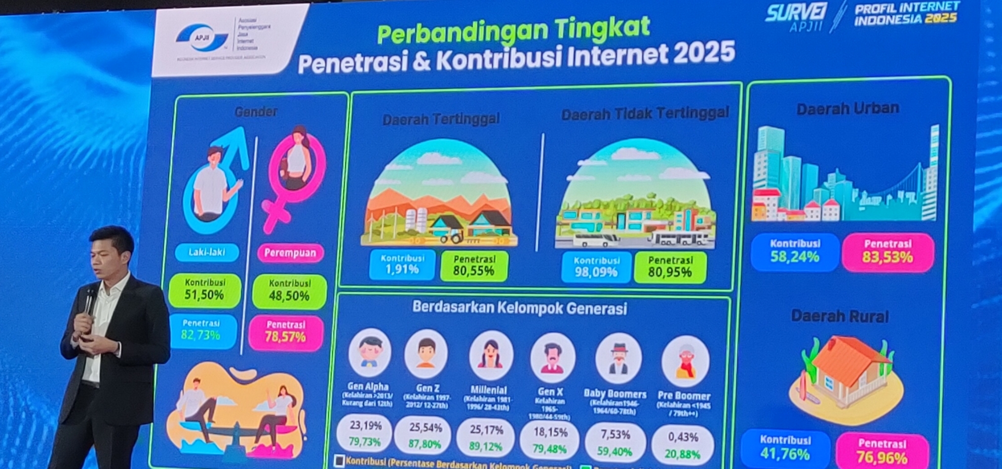 Angka tersebut menunjukkan adanya kenaikan dibandingkan tahun sebelumnya yang tercatat sebesar 79,50 persen. Meski pertumbuhannya hanya sekitar 1,16 persen, Ketua Umum APJII Muhammad Arif menilai peningkatan ini tetap menjadi indikator positif atas perluasan akses digital di Tanah Air.