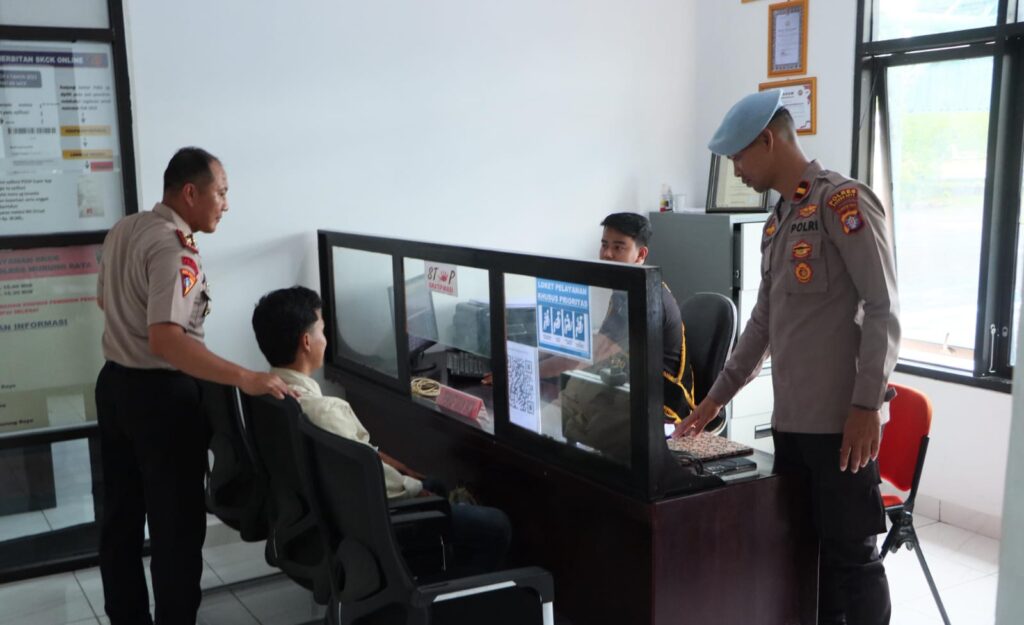 Puruk Cahu – Kapolres Murung Raya (Mura) AKBP Franky M. Monathen, melalui Wakapolres Kompol Puji Widodo didampingi Kasi Propam Ipda Endang Juliarso mengecek pelayanan pembuatan Surat Keterangan Catatan Kepolisian (SKCK) Online di Sentra Pelayanan Kepolisian Terpadu (SPKT) Polres Mura itu guna memastikan pelayanan berjalan optimal dan sesuai prosedur.